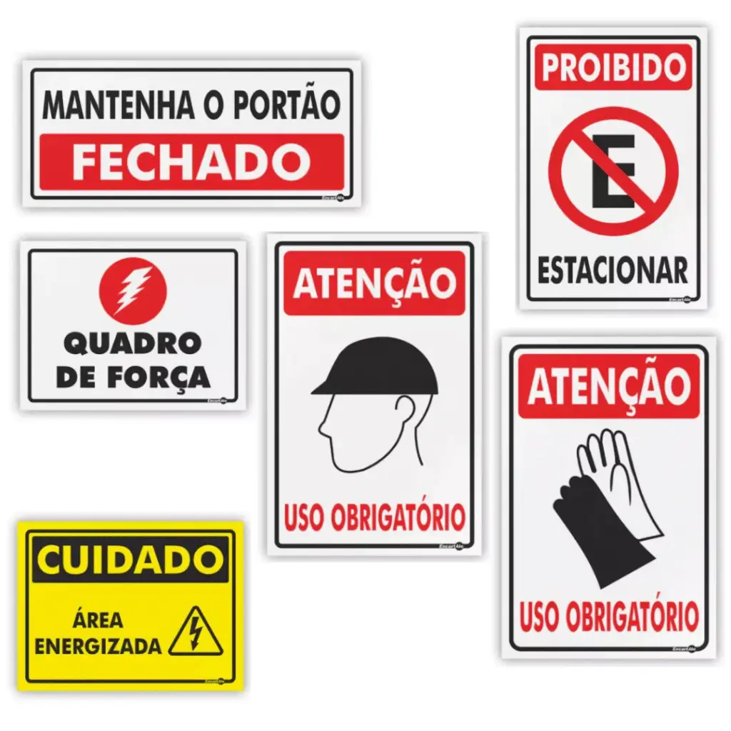 Placas de aviso, alerta, proibição, emergência, rotas de fuga, acessibilidade e personalizadas.